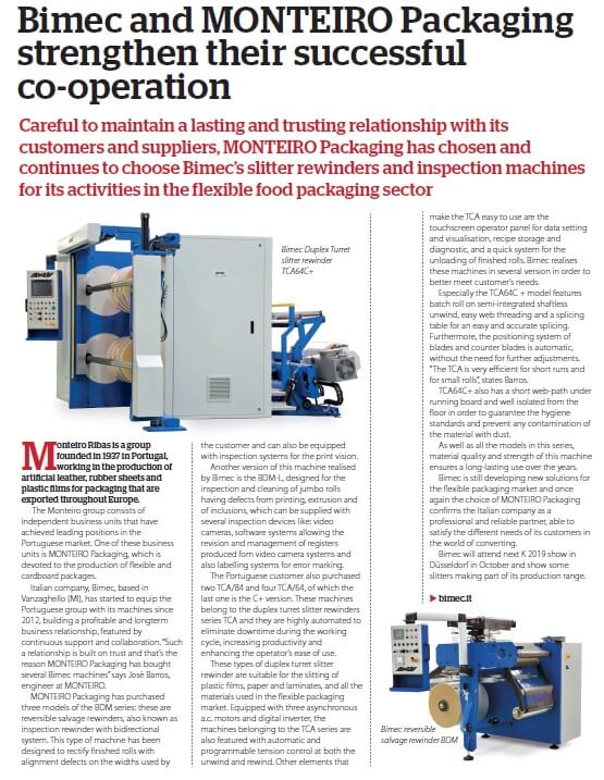 "Careful to maintain a lasting and trusting relationship with its customers and suppliers, MONTEIRO Packaging has chosen and continues to choose Bimec’s slitter rewinders and inspection machines for its activities in the flexible food packaging sector."